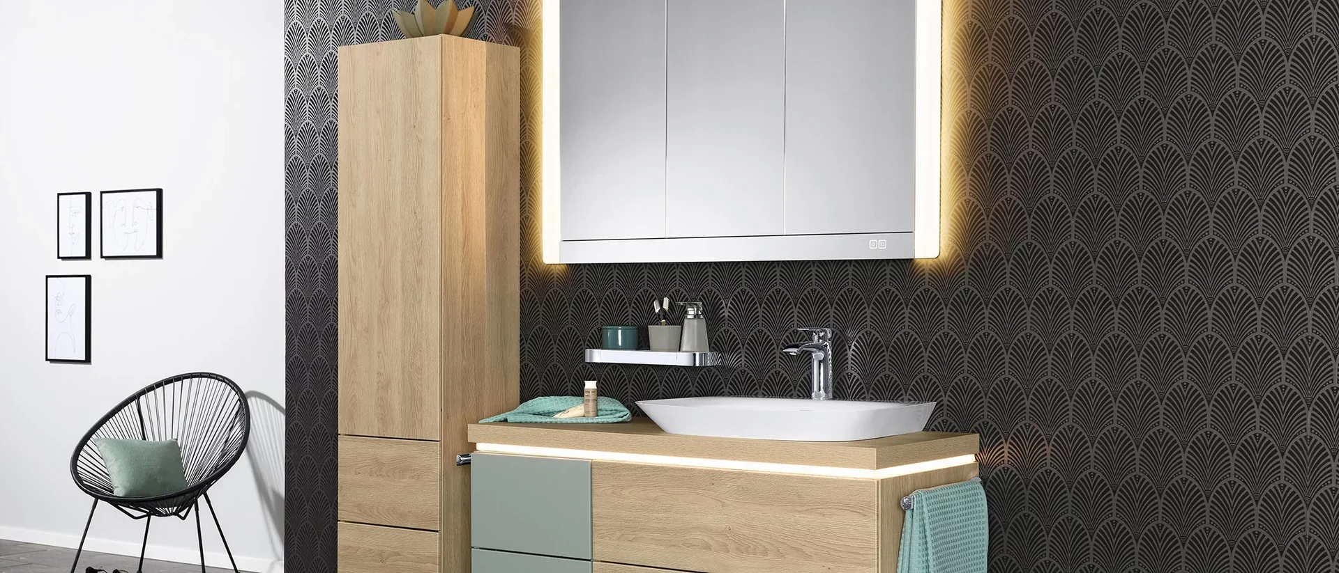 Ein Spiegelschrank kombiniert Beleuchtung, Stauraum und Spiegel in einem einzigen Möbelstück. Er sorgt für optimale Übersicht, schafft Struktur und ist ein unverzichtbares Element für ein gut organisiertes Badezimmer.